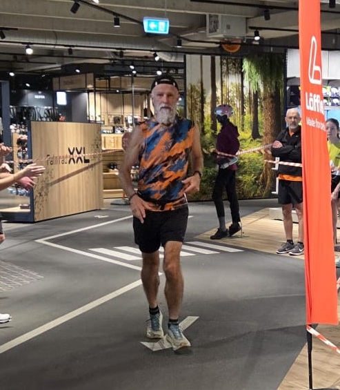 Helmut Rösch und Harald Fischer mögen es nicht so kalt: Sie starten beim ⇒Indoorlauf von Fahrrad XXL in Fürth. Harald läuft 12 Runden über 5,28 km und Helmut gönnt sich 23 Runden über 10,1 km. Die 440m lange Runde startet im Erdgeschoß, geht über eine 16%ige Rampe hoch ins 1.Obergeschoß und wieder zurück. Helmut gewinnt seine Altersklasse und Harald wird Altersklassenvize.